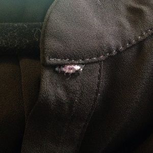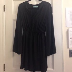 Bell sleeves, cinched waistline, and open V collar. Has an attached black slip on the skirt of the dress. Small tear on collar, hardly noticeable. Never worn, but tags have been removed.