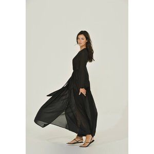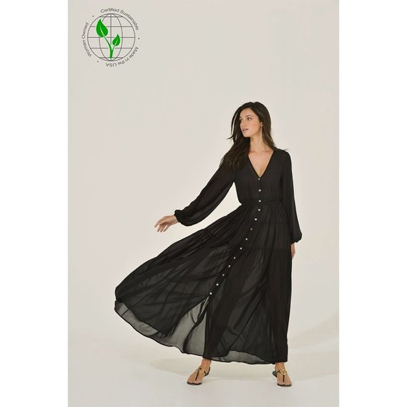 One of the most striking and flexible pieces in the collection is Intention’s black long sleeve semi-sheer Chiffon Maxi Dress. Made in the USA from 100% Recycled Polyester Chiffon featuring OEKO-TEX 100 certification, this show-stopping choice is a striking option for your eco-friendly wardrobe. This eye-catching maxi dress has been carefully designed to allow you a multitude of styling options. Whether you are headed to the beach and want the perfect bathing suit cover or headed to dinner and want to crank the vavoom factor up as the night goes on, this dress can be as sexy or serene as you want.