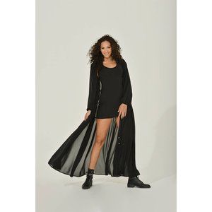 Our button-up maxi can be unbuttoned as high as you like to showcase your legs or worn more conservatively, such as Kurti-style over our stretch ankle pants. The Intention jersey tank dress was designed to be worn with our maxi dresses, so you have a ready option that lets you show as much or as little as you want to. This semi-sheer black chiffon maxi dress will be a favorite.