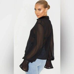 pretty little thing blouse, PLT top, black sheer shirt, mesh button down, ruffle cuff sleeve, satin trim blouse, dressy night out top, party club shirt, trendy Y2K style, sexy chic blouse.