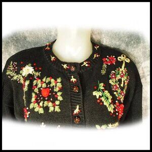 Handknit black cotton/ramie blend with gold beads, clear beads, pearl beads and more. Embroidery in many colors, including metallic gold. Felt heart appliques and more beads. Lots of dimension. Most of my pics are High Res so enlarge to see all the fun details. Buttons down front with embroidered and beaded buttons too. Small shoulder pads. Dated on the label! It is used of course, but there are no stains or flaws. Stated size is petite but check the measurements! It measures more like a medium. When you do, keep in mind that this has dropped shoulders, making the shoulder measurement wide and the sleeves seem short. ONE NOTE: the beaded buttons are very pretty but the beads make it hard to button them. You may want to keep it buttoned and use as pullover...