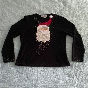 Celebrate the festive season with this charming black Christmas sweater featuring a delightful Santa design. Perfect for adding a touch of holiday spirit to your wardrobe. Measures 19” across chest, 16” shoulders, 24” shoulder to hem, and 24” shoulder to hem.