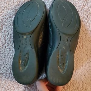 Black Clarks In-motion shoes. Has been worn lightly, has a small almost unnoticeable skuff on right ones frount / tip. Women's 9.5