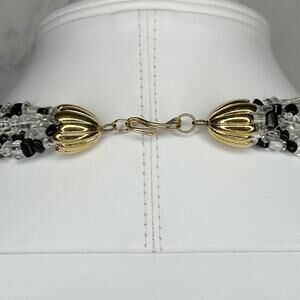 Such a dramatic and unique statement piece! This multi-strand necklace features beautiful black and clear beads with an eye-catching arrow-shaped pendant. The pendant is actually a converted brooch that's been permanently attached - so creative and one-of-a-kind!