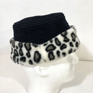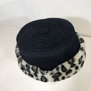 Black Cloche Hat with Leopard Print Faux Fur Brim, One Size, Vintage