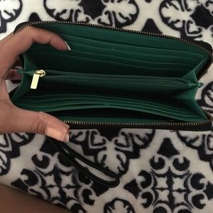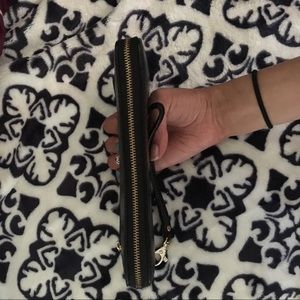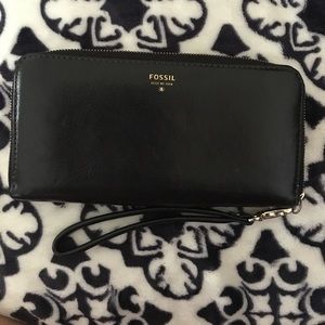 A large black clutch wallet from Fossil! It hold up to 12 cards and has two coin zippers. It's a teal blue on the inside. Also has a wristlet handled. It's in perfect condition! Only used a few times.