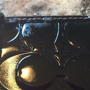 Black Coach Wallet - pre-owned. I tried to capture the scratches on the hardware in the picture and there are several areas that are scuffed. The price is reflective of those areas of concern.