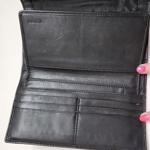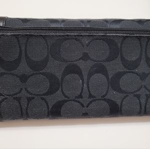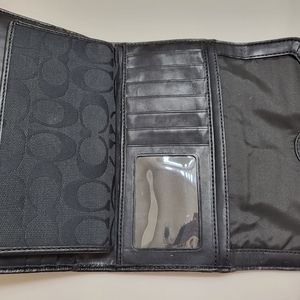 Black Coach Signature wallet. Outside zipper pocket. Inside - 12 card slots, ID slot, check holder, 2 pockets for cash. EUC.