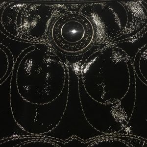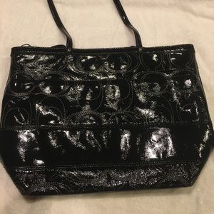 VGUC! Black, shiny patent leather COACH purse. No interior or exterior stains. Outside pocket. Three interior pockets. Shoulder straps. Light weight. Main compartment of purse does zip. Purse measures fourteen inches in length by three and a half inches in width. The depth of the purse is ten inches. The drop of the purse or straps from top of shoulder to the top of the purse is nine inches.