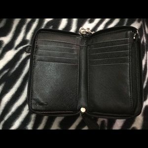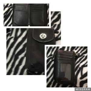 Black Coach wristlet, with silver hardware, pocket in front measures 5 inches width of pocket is 3 inches. Closed is 6 inches. On the inside w-7 inches,l-6 inches 8 card slots, 1 slot for $, 2 side pockets, and a zippered pocket for change.outside and ID slot as well as 3 credit card slots.cute wristlet, used a couple of times.