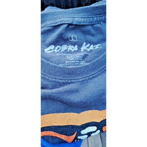 This black Cobra Kai t-shirt with an eye-catching orange cobra print on the front is a must-have for fans of the iconic movie franchise. Made from high-quality materials, this regular fit t-shirt is comfortable and perfect for any sports-themed occasion. The short sleeve design ensures that you stay cool and comfortable throughout the day. The shirt is available in size L and is suitable for men and/or women. The black color and kungfu theme make it a versatile addition to any wardrobe. Whether you're going to a casual outing or a sports event, this Cobra Kai t-shirt is sure to turn heads.