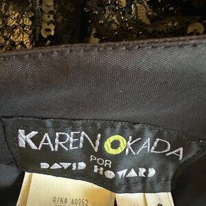 Karen Okada black designer dress with luxe lace + beaded detailing. Size 6 but fits more like a size 4—super flattering + shapely!