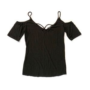 Forever 21 black ribbed knit top with cold shoulder cutouts and Strappy criss cross caged front neckline, has stretch, slightly cropped, good condition, dress it up or down, super cute and versatile