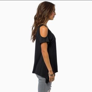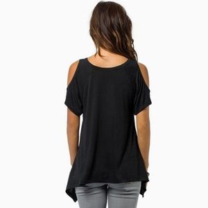 Black Cold Shoulder tee! Flattering V neck with fishtail hem. Great Basic for your wardrobe! 100% polyester.