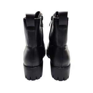 These black combat-style ankle boots seamlessly merge practicality with style. Crafted from faux leather, these boots offer a robust and durable build, perfect for everyday wear. The lace-up design provides an adjustable fit, while the side zipper ensures easy on and off. The thick lug sole adds traction and stability, making them ideal for various terrains and weather conditions. Their classic yet trendy design makes them versatile, suitable for both casual and semi-formal ensembles.