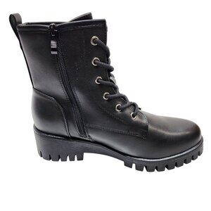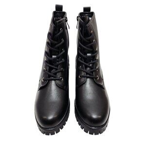 These black combat-style ankle boots seamlessly merge practicality with style. Crafted from faux leather, these boots offer a robust and durable build, perfect for everyday wear. The lace-up design provides an adjustable fit, while the side zipper ensures easy on and off. The thick lug sole adds traction and stability, making them ideal for various terrains and weather conditions. Their classic yet trendy design makes them versatile, suitable for both casual and semi-formal ensembles.