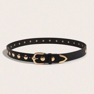 Add a touch of edge and modern style with this black pin buckle belt, showcasing a gold rivet design in a punk Y2k cowgirl aesthetic. Lets Go!!