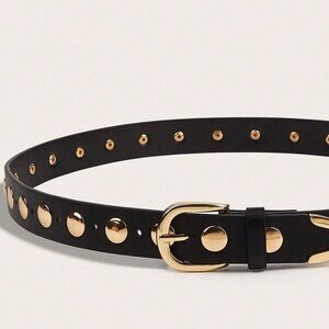 Add a touch of edge and modern style with this black pin buckle belt, showcasing a gold rivet design in a punk Y2k cowgirl aesthetic. Lets Go!!