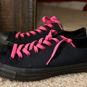 Black/black Converse Chuck Taylor shoes with hot pink places. Men's size 10.5 Women's size 12.5 In excellent like new condition