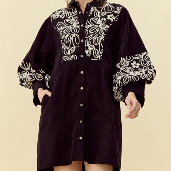 Ease into Winter with style and confidence in the Touch of Class Dress. Perfect for any occasion, this versatile corduroy dress can be dressed up or down to suit your needs. It features a collared neck, front snap buttoned closure, side pockets, three quarter balloon sleeves, wide band buttoned cuffs, and charming embroidered details for a touch of elegance. Lightweight material and non-sheer are always a bonus!