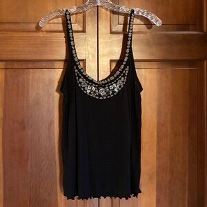 Black Cotton Tank Top With Beaded Neckline - Adjustable Straps - Size Large