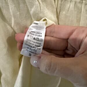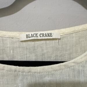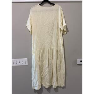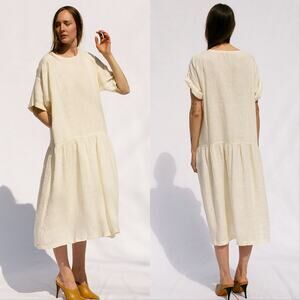 Black Crane Linen Easy Dress in Vanilla. Women's Size S / Small. Features woven fabric, wide crew neck, short sleeve, dropped shoulder, side seam pockets, pullover style, unlined, long midi length, drop waist, oversized look, made in USA. 100% linen. Great used condition, no notable flaws.