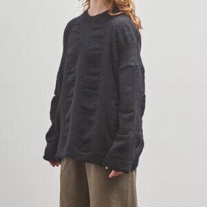 "A relaxed unisex style with an oversize fit, drop shoulder long sleeves, and crew neckline. Knit from a super soft mohair wool blend with textured ruched panels inspired by searsucker fabric. Finished with rib knit detailing at the cuff, neck and hemline."
