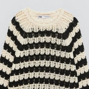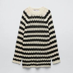 Black Cream Striped Pointelle Open Knit Long Sleeve Pullover Tunic Sweater (NWT)