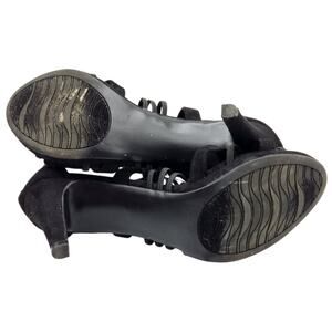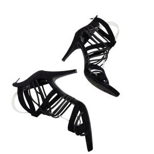 stella heels, black strappy sandals, size 9M, cage heel design, evening footwear, back zip closure, stiletto silhouette, textile upper, formal shoes