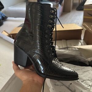Step out in style with these chic black croc-embossed ankle boots. Perfect for any occasion, these lace-up boots offer both comfort and elegance.