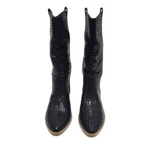 Black Croc-Embossed Mid-Calf Western Boots Size 6M Faux Leather Upper Block Heel