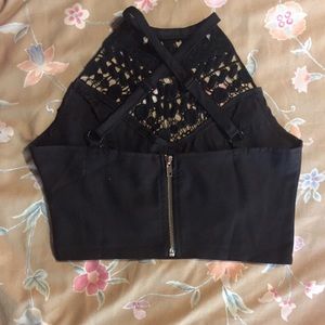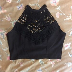 High neck black crochet top from Lf! Beautiful, intricate design. The back has adjustable criss crossed straps and a gold zipper. Perfect to wear if you're going clubbing but is also elegant enough for a formal event! Only been worn once! Size medium but runs small!