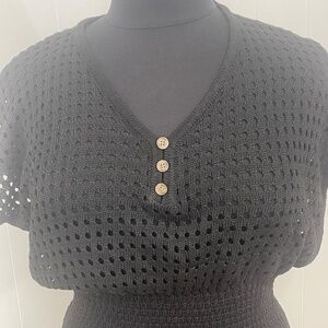 Chic and versatile black crochet knit mini dress in size XL — perfect as a casual summer dress or a stylish beach cover-up. The dress features a v-neckline with three front buttons, short sleeves, and a stretch smocked waistband for a flattering fit. Lightweight open-knit design allows for breathability and comfort.