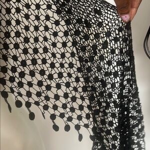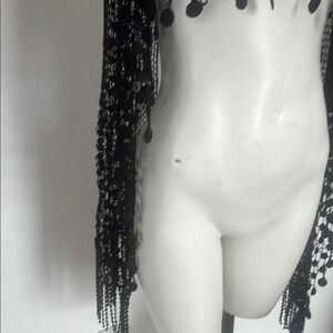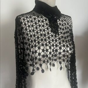 Elegant black crochet poncho featuring intricate beaded details. Perfect for adding a stylish layer to any outfit.