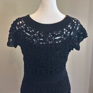 features a round neckline, short sleeves, and an intricate floral crochet pattern throughout. The tunic has a fitted silhouette with a solid black band at the waist and a scalloped crochet hem.