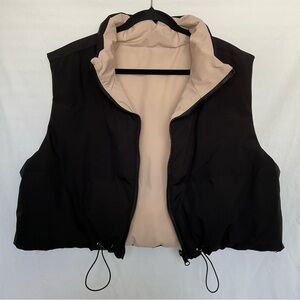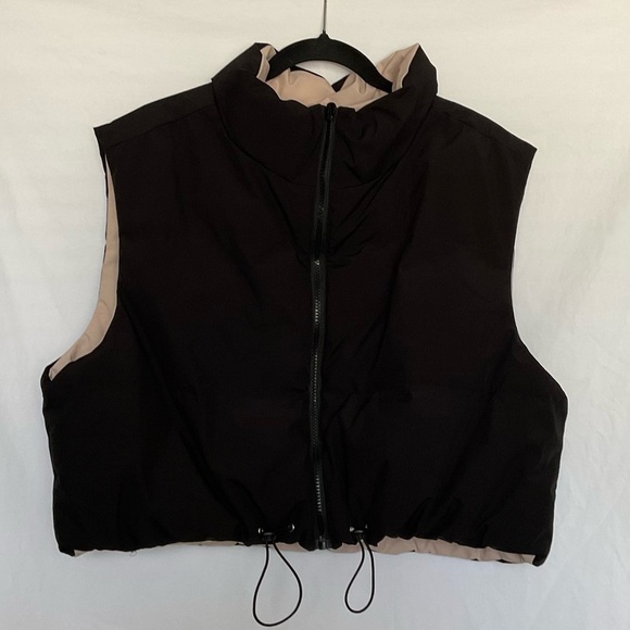 This black cropped vest features a high collar and a full front zipper closure, offering a modern and sporty look. Made from a thick, fleece-like material, it provides warmth and style, perfect for layering in cooler weather. The adjustable cord at the bottom hem ensures a snug fit, making it a versatile addition to any wardrobe.