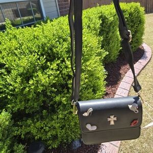 Elegant black crossbody bag featuring unique embellishments. Perfect for adding a touch of style to any outfit.