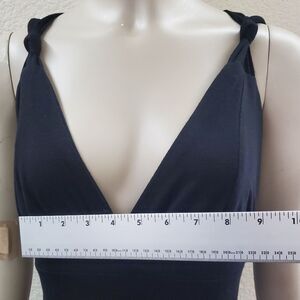 Description: Classy and sexy dress. Plunging neckline. Double straps with a criss-cross strap on the back. Gathered circle skirt style dress.