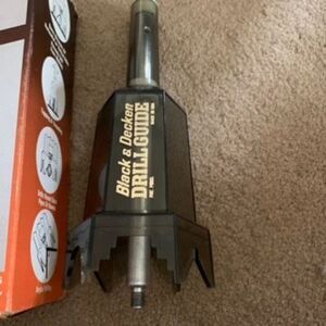 Black & Decker Drill Guide #71-055. Fits 1/4” & 3/8” electric drills. Good condition. Lid of box missing.