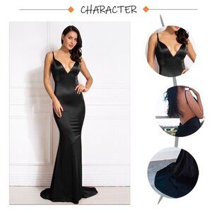 Black Deep V Neck Backless Ruched Long Slip Sheath Dress Evening Gown Prom