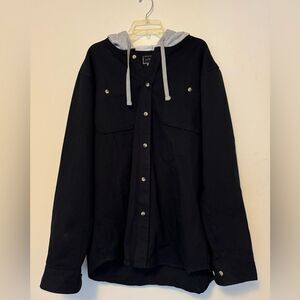 Stylish black denim button-up jacket featuring a gray hood. Perfect for casual wear. Worn once, in perfect condition.