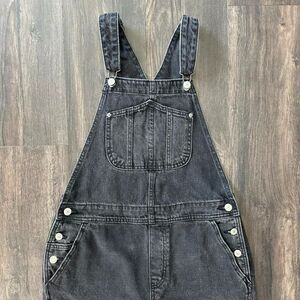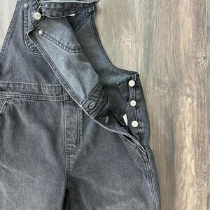 Non-distressed, washed pure black 100% cotton denim bib overalls. Adjustable shoulder straps.
