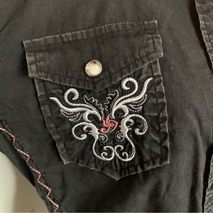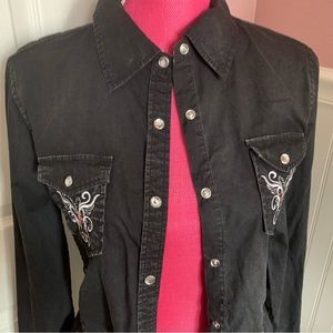 Black Denim Cowgirl Button Down with Pearl Buttons, Pink/White Embroidery