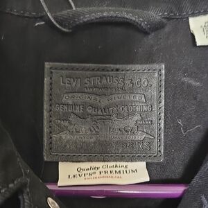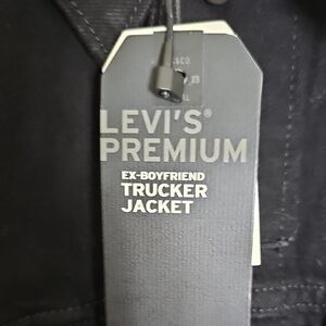 Levis Exboyfriend Trucker Jacket black denim with button closure. 100% cotton non-stretch twill front button long sleeves with button cuffs