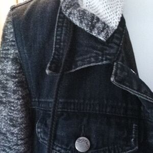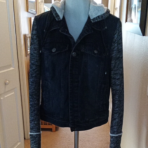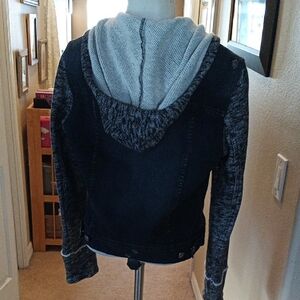 Black Denim Jacket with Gray Knit Sleeves And Removable Hood Size Medium