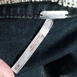 Stylish Free People black denim jacket featuring gray knit sleeves and a cozy removable hood size medium ( just spotted a teeny hole in hood) Perfect for casual outings.