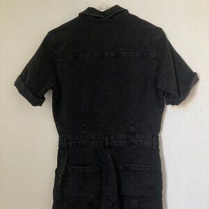 Denim style cotton fabric with a lot of stretch. Pants are floor-length and straight leg style, a bit flared at the bottom. Short sleeve. Two side pockets. Two patch pockets on the back. Zip fastening on the front section.