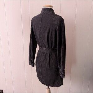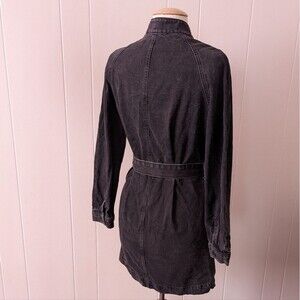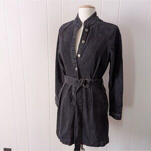 Zara long sleeve black denim belted mini dress. Non stretch denim in a faded black color. Has an adjustable matching belt. Has two pockets. Made in Turkey. Marked a size USA M- 18.5" armpit to armpit, 27" waist, approx. 37" hips (measured under button placket), 33" long. In great condition with a little light wear (see photos). There is also a small crinkle in the stitching that is from the garments manufacturing.