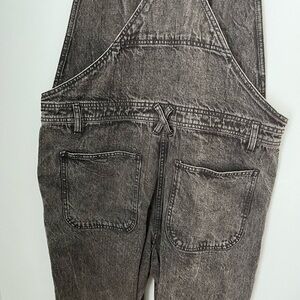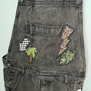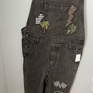Black Denim Overalls with Adjustable Straps and Colorful Patches