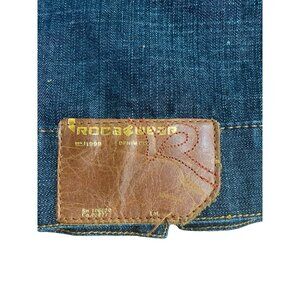 Stylish and comfortable Black Denim Rocawear CembR Button Down Jacket, perfect for casual outings or a night out. Crafted for durability and designed for a relaxed fit, this jacket is ideal for those who appreciate a blend of fashion and function. Black jean jacket with light brown contrasting stitching. Two big front pockets. Big R on one of the front pockets. Lots of great detail. It is a pointed collar and metal buttons for closure.